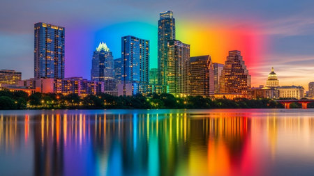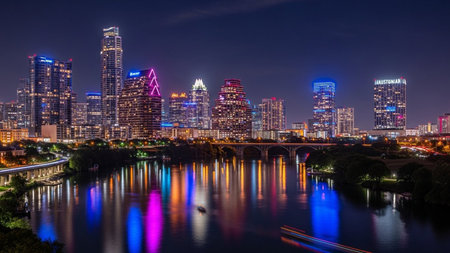 The vibrant Austin, Texas skyline glows with countless lights as dusk settles over the city. Modern skyscrapers and architectural marvels are reflected in the dark waters of the Colorado River. Several boats with colorful lights cruise along the river, leaving trails of light in their wake. A bridge spans the river, adding to the urban panorama. The scene is a dynamic and colorful representation of a bustling city at twilight.