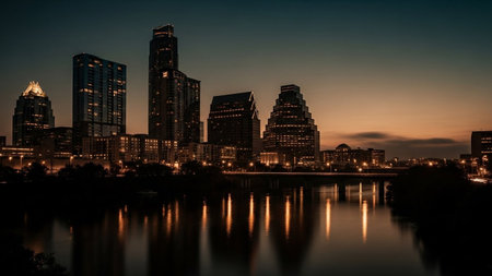 The Austin, Texas skyline is captured at dusk, with its modern skyscrapers illuminated by countless lights. The warm glow of the setting sun creates a contrast with the deepening blue of the twilight sky. The city's impressive architecture is mirrored perfectly in the calm waters below, creating a symmetrical reflection. A bridge can be seen in the distance, adding to the urban panorama. The scene conveys a sense of vibrant city life and architectural grandeur.