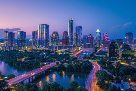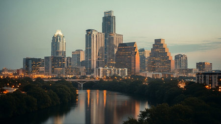 A panoramic view of the Austin, Texas skyline at dusk. Tall modern skyscrapers dominate the city center, with a prominent bridge spanning the Colorado River. The river reflects the illuminated buildings and the soft twilight sky. Lush green trees line the riverbanks, contrasting with the urban landscape. The overall mood is serene and capturing the essence of a thriving city at the close of day.