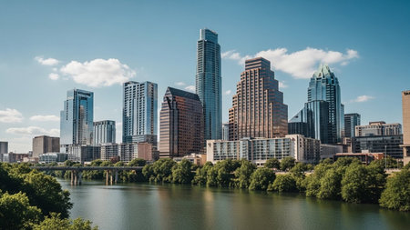A wide shot of the Austin, Texas skyline showcases a collection of modern skyscrapers of varying heights and architectural styles. The buildings are set against a vibrant blue sky dotted with fluffy white clouds. In the foreground, a calm river flows, reflecting the cityscape and the surrounding lush green trees. A bridge is visible spanning the water, connecting different parts of the city. The overall scene is bright and sunny, conveying a sense of a thriving urban environment integrated...