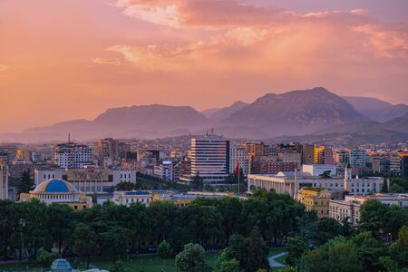 Areal view of Tirana city center at sunset.