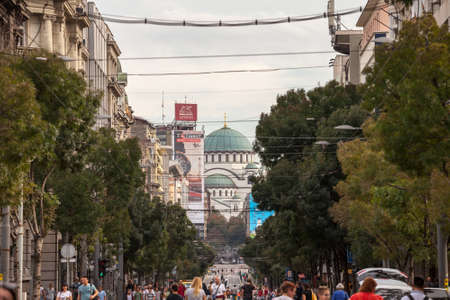 BELGRADE, SERBIA - SEPTEMBER 28, 2019: Saint Sava Cathedral Temple (Hram Svetog Save) in the afternoon seen fron the nearby streets with a crowd of people. This orthodox church is the main monument of Belgrade. Picture of the belgrade Cathdral Temple of S