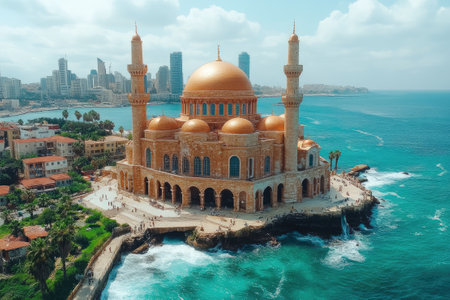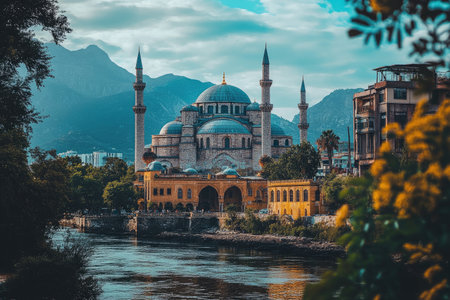 A Mosque in a City by a River with Mountains in the Background