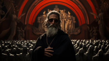 Portrait of an old priest with long gray hair and beard wearing sunglasses standing in front of a crowd.