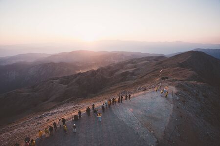 People enjoy the sunset on the observation deck of Tahtali Mountain near Kemer, Aetalia, Turkey