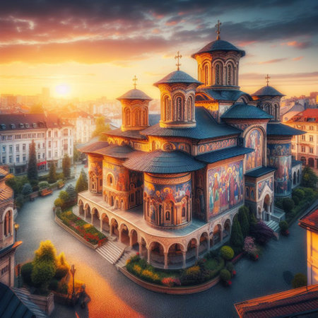 Historic romanian orthodox church facade at sunset with architectural details. May 3, 2025 Constanta Romania.
