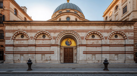 A detailed view of a European church's entrance, highlighted by its distinctive striped stone facade, arched entryway, mosaic artwork, and classical dome structure.