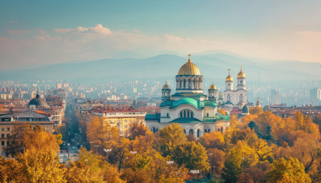 Sofia, Bulgaria - Sep 8 2020: A view over Sofia with Alexander Nevski Cathedral visible in the rear