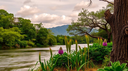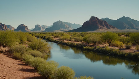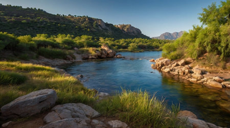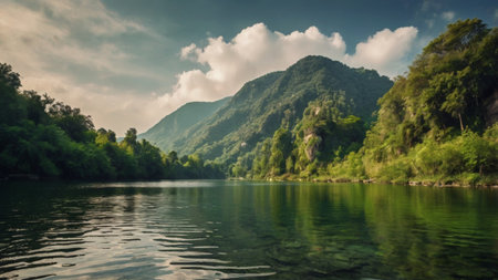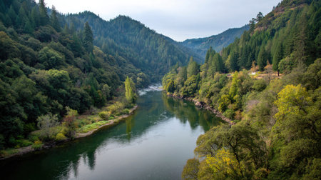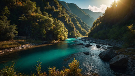 Experience the tranquility of a vibrant river flowing through lush forests and mountains, creating a breathtaking landscape perfect for outdoor adventures and relaxation.