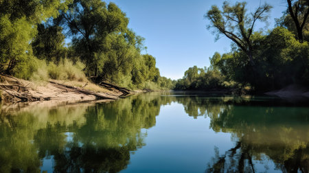 A picturesque scene capturing the stillness of a riverbank flanked by vibrant autumn trees, featuring clear water reflections and a flawless blue sky, ideal for nature lovers.