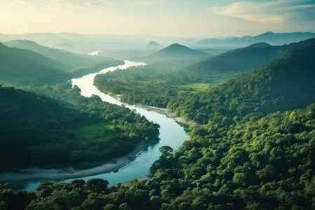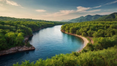 A scenic view shows a river twisting through dense green forests and mountains. Bright sunlight illuminates the landscape, highlighting nature's beauty and tranquility.