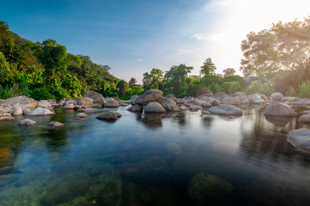 River stone and tree with sun light, View water river tree, Stone river and sun ray in forest