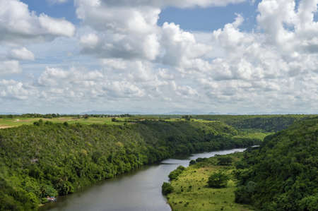 Chavon River, riverbed, tropical vegetation, the sky is covered with clouds in the background, the province of La Romana, the Dominican Republic