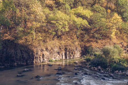 Forest flowing stream picturesque view among the trees sunlit grove. Armenian stock photo