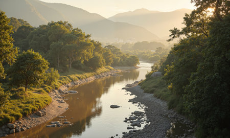 A picturesque sunset over a flowing river, nestled amidst tranquil mountains. The golden hour casts a serene glow.