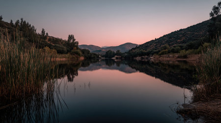 This stunning image captures a serene lake at dusk, framed by lush greenery and majestic mountains under a soft pink sky, creating a tranquil nature landscape.