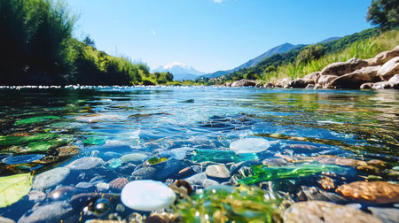 A beautiful river scene showcasing clear waters filled with colorful pebbles, surrounded by lush green trees, creating a peaceful and serene atmosphere.