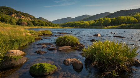 A serene river flows gently over smooth stones, surrounded by lush green trees and majestic mountains, showcasing nature
