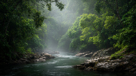 A tranquil river flows through a lush jungle, showcasing clear water over smooth stones, surrounded by vibrant greenery and misty mountains, ideal for nature lovers.