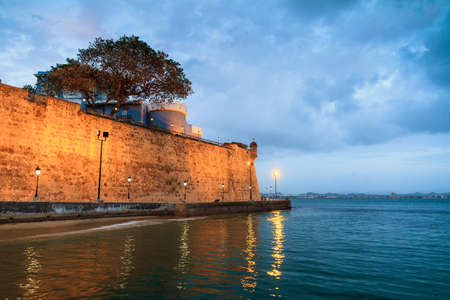 Ancient wall with promenade around the city of San Juan in Puerto Rico at nightfall