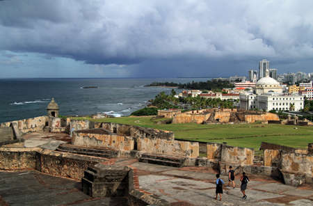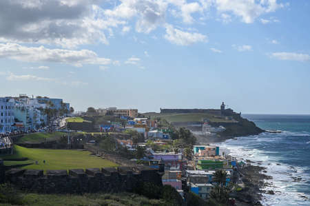 Coastline San Juan looking towards fort San Cristobal and the Santa Maria cemetery from Del Morro, on a summer day