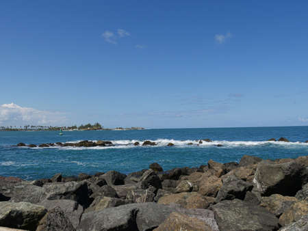 Boulders of stones piled right next to the blue waters at the walkway of Fort El Morro in Old San Juan, Puerto Rico.