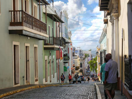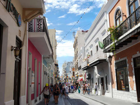Old San Juan, Puerto Rico - March 29, 2015: Cobblestone street scene from Old San Juan, Puerto Rico with colorful buildings and people walking.