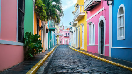 Colorful houses lining the streets of Old San Juan, Puerto Rico, with space for copy