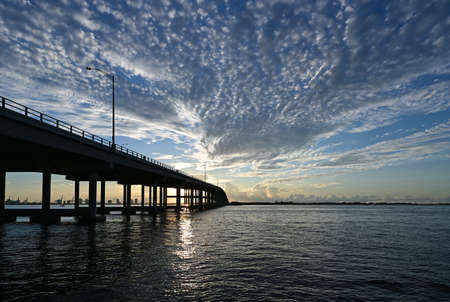 Rickenbacker Causeway Bridge in Miami, Florida under dramatic summer cloudscape at sunrise.
