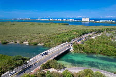 Cancun aerial view of nichupte lagoon at hotel zone in mexico