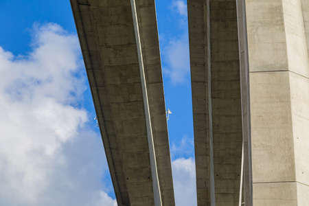 Bottom view of elevated concrete highway. Overpass concrete road. Road flyover structure. Modern motorway. Transportation infrastructure. Concrete bridge engineering construction. Bridge architecture.