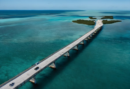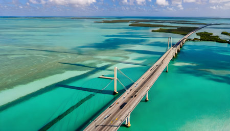 Aerial view of a majestic ocean bridge with cars cruising over its length in stunning clarity