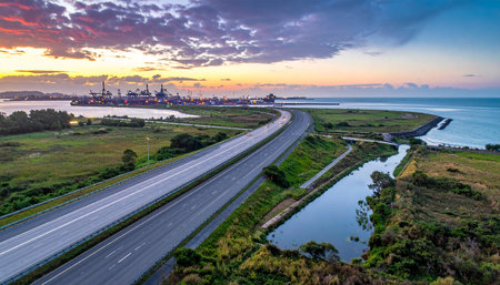 Panoramic view of the road and the port at sunset.