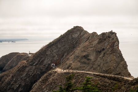 Man in outdoor cloths standing alone on a hill by the ocean overlooking the Point Bonita Lighthouse on a foggy San Francisco day, California, United States of America, USA