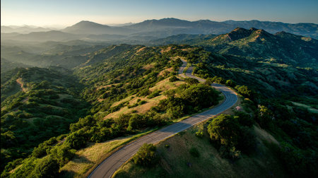 Scenic Mountain Road Winding Through Rolling Hills at Golden Hour