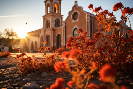 A breathtaking sunset illuminates a charming church surrounded by vibrant flowers and lush greenery, creating a peaceful and picturesque view.