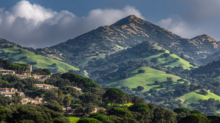 A stunning view of a verdant hillside with a vibrant city skyline visible in the distance, Panoramic view of a city situated on rolling hills, AI Generated
