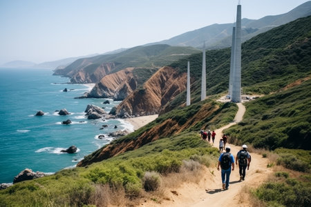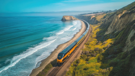 A passenger train moving along coastal tracks, transporting people with stunning ocean views on one side and cliffs on the other.