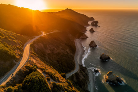 An aerial shot of a stunning coastal road with sweeping ocean views, dramatic cliffs, and the sun setting on the horizon, casting a golden glow.