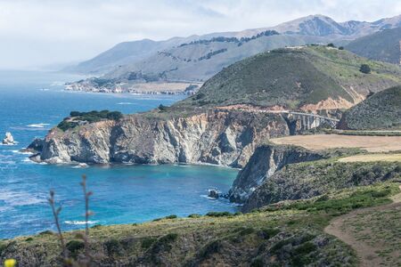 a stunning photograph of big sur captures the essence of an ideal vacation. the dark gold and light aquamarine hues create a romantic landscape, reminiscent of the picturesque scenery. shot with a rollei prego 90, the atmospheric imagery showcases the beauty of this destination. the light indigo and white tones add to the surreal ambiance, while the use of unreal engine 5 enhances the landscape