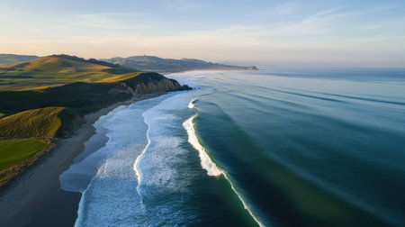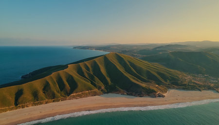 Experience a breathtaking coastal landscape at sunrise, where gentle waves meet a misty beach framed by majestic mountains, showcasing nature's beauty.