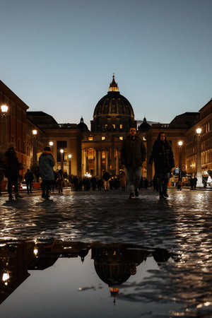 Vatican, Vatican City - December 7, 2023: Panoramic night view of St Peters Basilica with beautiful reflection in Vatican City. Architecture, landmark and attractions of Rome, Italy. Vertical photo