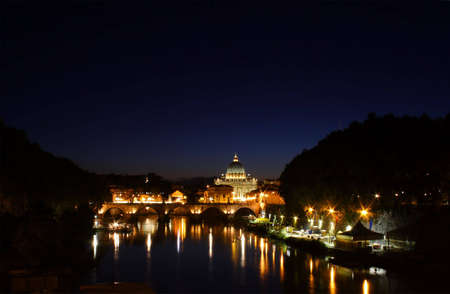 River Tiber in Rome with Vatican City St Peters Basilica and Ponte Vittorio Emanuele II at night