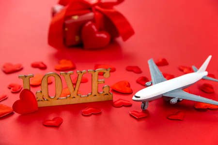 Valentine's card, beautiful red background with airplanes. selective focus. love.