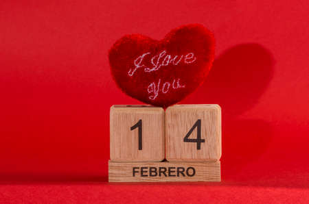 Fluffy heart, big wooden cubes forming the number fourteen and little rectangle with the word febrero against red background for Valentine's Day