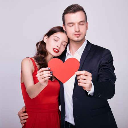 Beautiful romantic couple isolated on a gray background. Attractive young woman and handsome man hugging with a red heart in their hands. Happy Valentine's Day.