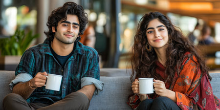 Relaxed Young Couple, Indian Ethnicity, Enjoys Beverages on Sofa in Bright Living Room Setting