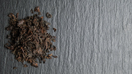 Pile of scattered black tea on a stone plate with copy space. Concept of a tea shop.
