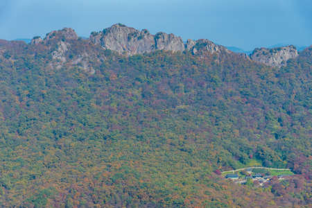 Rock Kakuenbou, a massive rocky mountain. Symbol of Mitake Shosenkyo Gorge. A popular tourist attractions. Autumn foliage scenery view in sunny day. Kofu, Yamanashi Prefecture, Japan