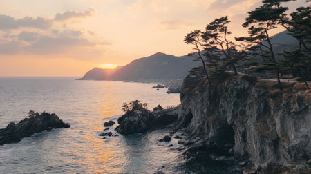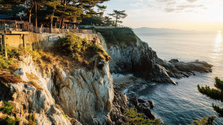 Coastal Pathway at Sunrise with Seaside Cliffs and Pine Tree